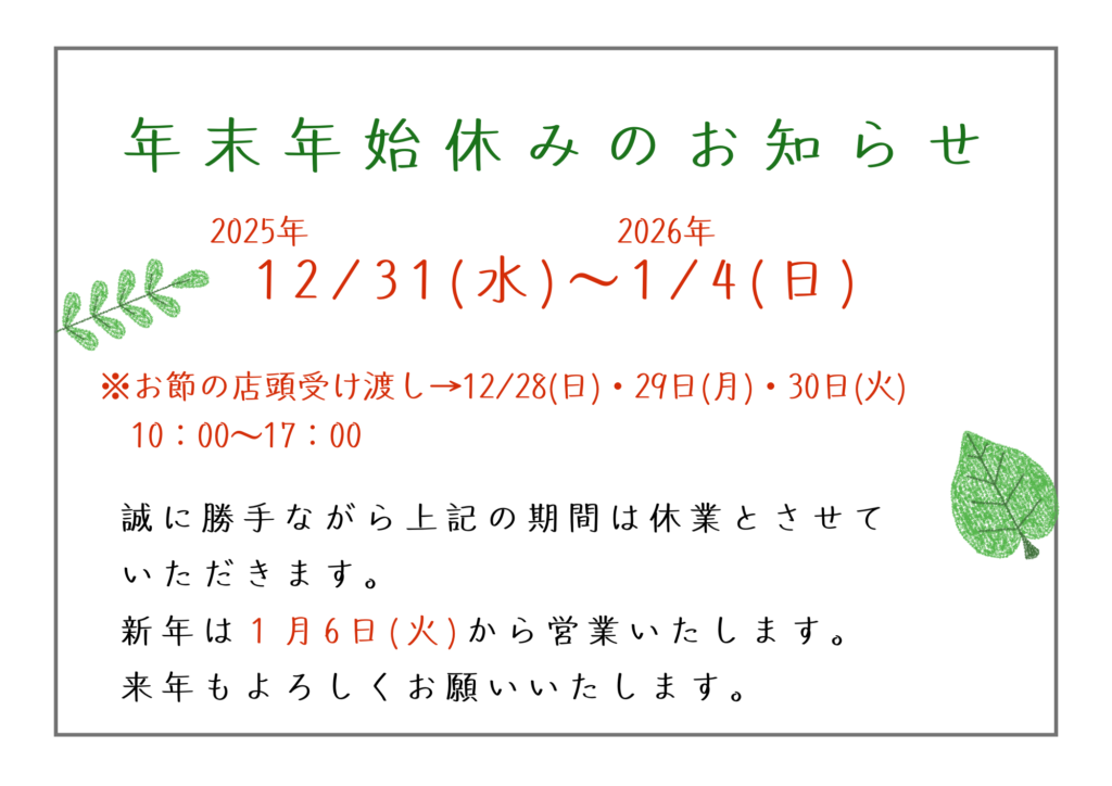 皆様、誠にありがとうございます。年末年始の営業は添付画像のとおりと