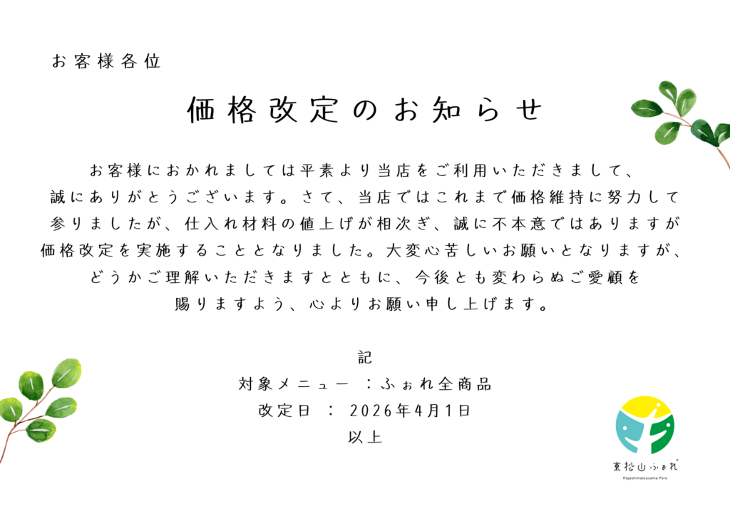 ふぉれ商品 価格改定のお知らせ