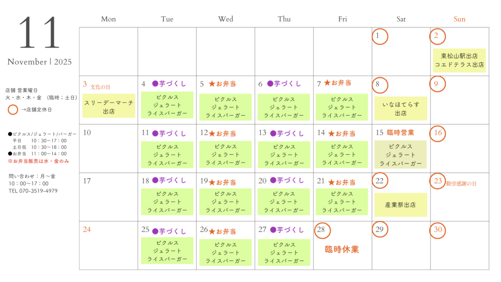遅くなりましたが、こちらのカレンダーで営業日・イベント出店などの確認をお願いいたします。